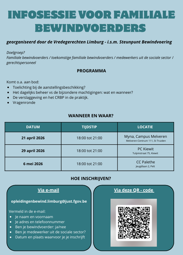Deze infosessie voor familiale bewindvoerders wordt georganiseerd door de Vredegerechten Limburg i.s.m Steunpunt Bewindvoering.